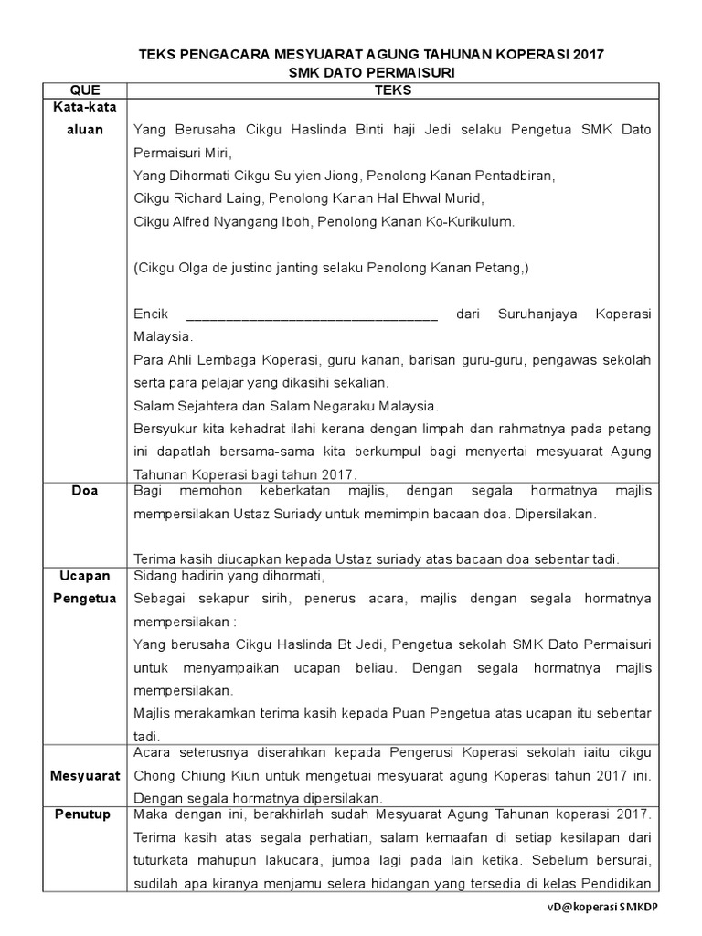Teks Pengacara Mesyuarat Agung Tahunan Koperasi 2018 Pdf